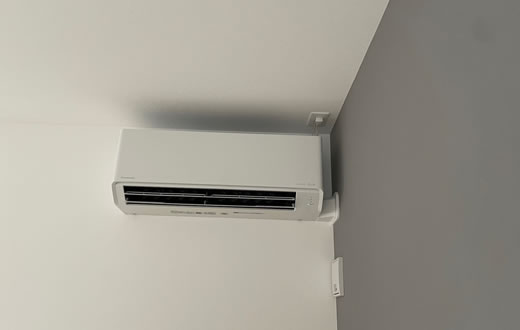 風向きを意識して、室内機の場所をこちらにご希望。室内機の真裏は隣室ということと、右側も柱があり穴あけは右手前側に施工。室内カバーも設置。